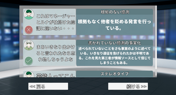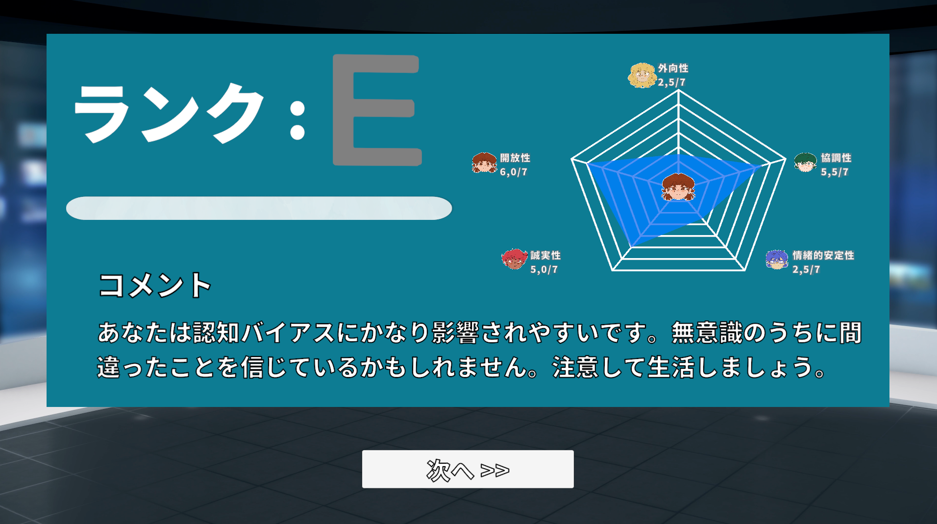 ゲームが終了すると,リザルトが表示される.リザルトはCredibilityゲージの残量に応じてRank, Commentsが変化する.また,プレイヤーの答えた問題の一覧も表示され,自身の各設問への正誤とそれに対する解説を見ることができる.
