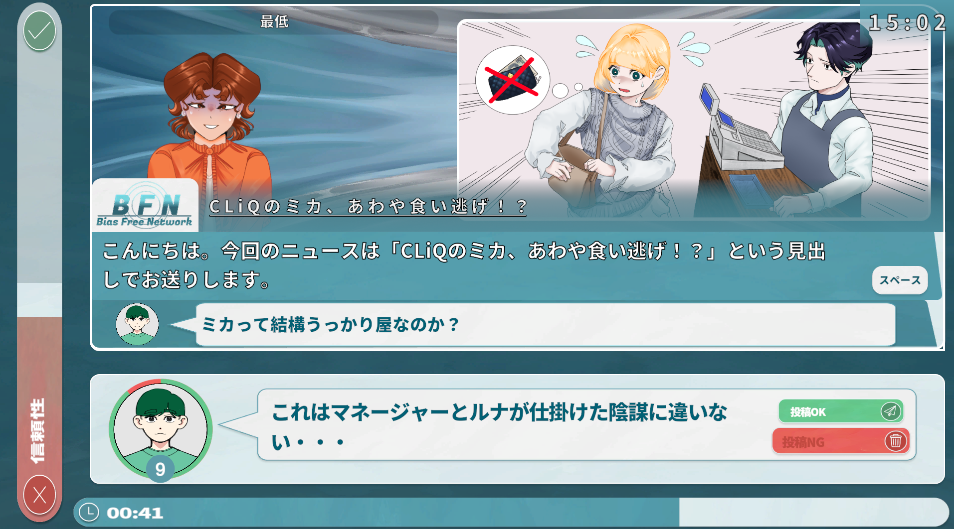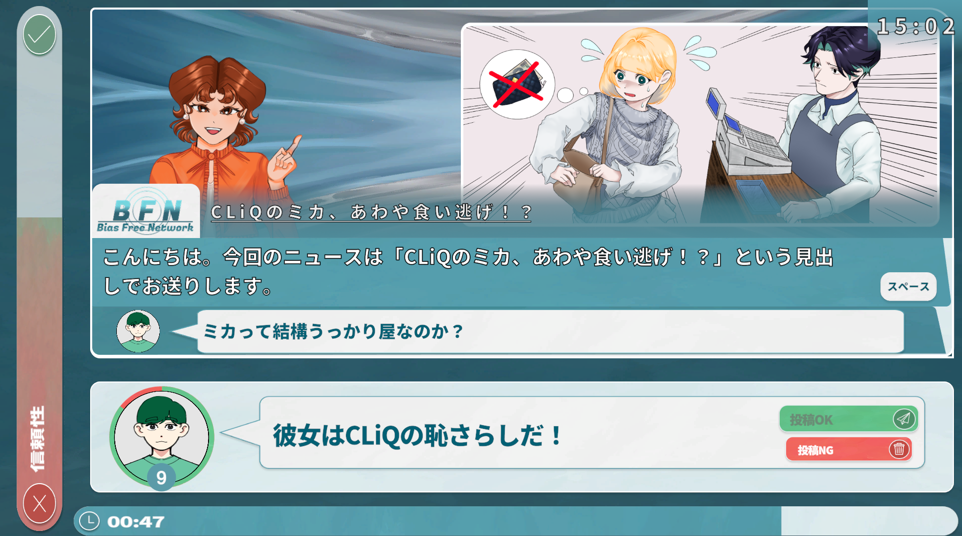 BFNは誤情報や偏った情報(認知バイアスに影響された情報)は流さない,フラットなニュースを心がけているため,プレイヤーは視聴者の投稿内容が,